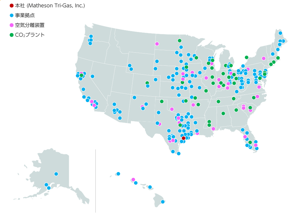 「MATHESON」のブランドで、事業を展開しています。2004年以降、積極的にM&Aや設備投資を実施し、現在ではエアセパレートガス(酸素、窒素、アルゴン)から炭酸ガス・ドライアイス、ヘリウム、水素、アセチレン、特殊ガスに加え、HyCO(水素と一酸化炭素、及び合成ガス)まで、取り扱い製品ラインナップを拡充し、世界最大規模の産業ガス市場である米国で、国を代表するサプライヤーの役割を担う存在に成長しています。