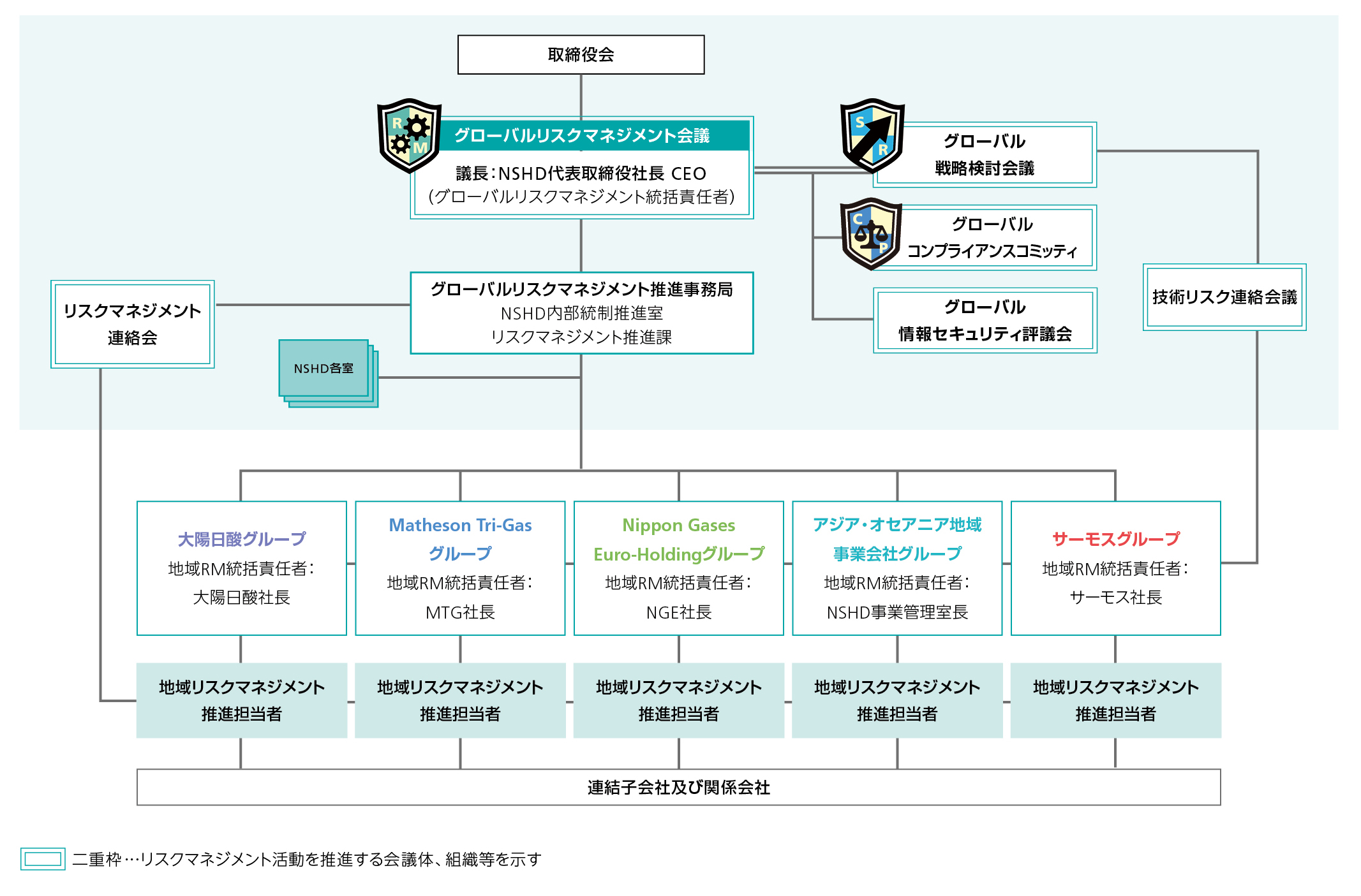 日本酸素ホールディングスグループは、純粋持株会社体制への移行を機に、よりグローバルな視点に基づく、全社的なリスクマネジメント体制を構築いたしました。「グローバルリスクマネジメント会議」を中心に、グループにおける役割と責任を明確化し、経営上のリスクを中長期視点から評価し、リスクマネジメント活動の最適化を図っています。代表取締役社長 CEOは、「グローバルリスクマネジメント統括責任者」として、全社的なリスクマネジメント体制の整備・運用に関する最終的な責任を担います。