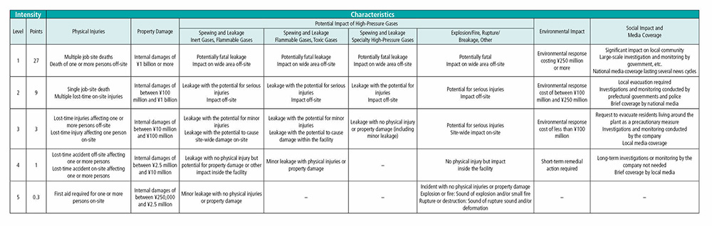 Taiyo Nippon Sanso Corporation has developed its own accident intensity standards, based on the Center for Chemical Process Safety (CCPS) evaluation method* and in consideration of the potential impact of high-pressure gases. The company evaluates accidents in Japan based on a five-level scale and five characteristics: (1) physical injuries, (2) property damage, (3) potential impact of high-pressure gases, (4) environmental impact, and (5) social impact and media coverage. The evaluation results in an overall number of points by which the company quantifies intensity.
