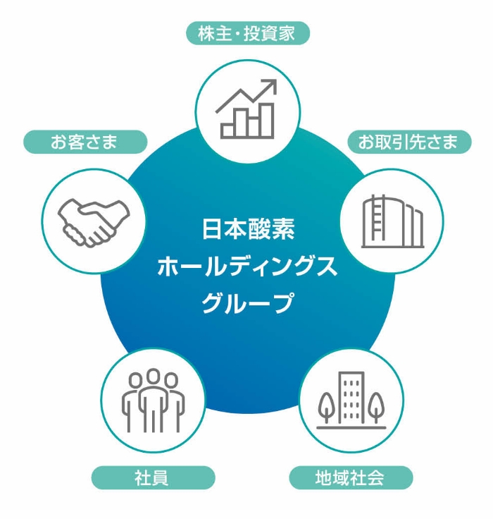 当社の社会的責任やステークホルダーとの関係については、日本酸素ホールディングス行動規範の一部として、「2.説明責任・ステークホルダーの尊重」を定め、CEOによりグループ内に周知・徹底されています。また、当社は、事業活動の一環として関連性の高い持続可能な開発目標 (SDGs) をはじめ、さまざまな社会・環境における課題があることを認識し、マテリアリティの特定を通じて、その解決につながる活動に注力してまいります。