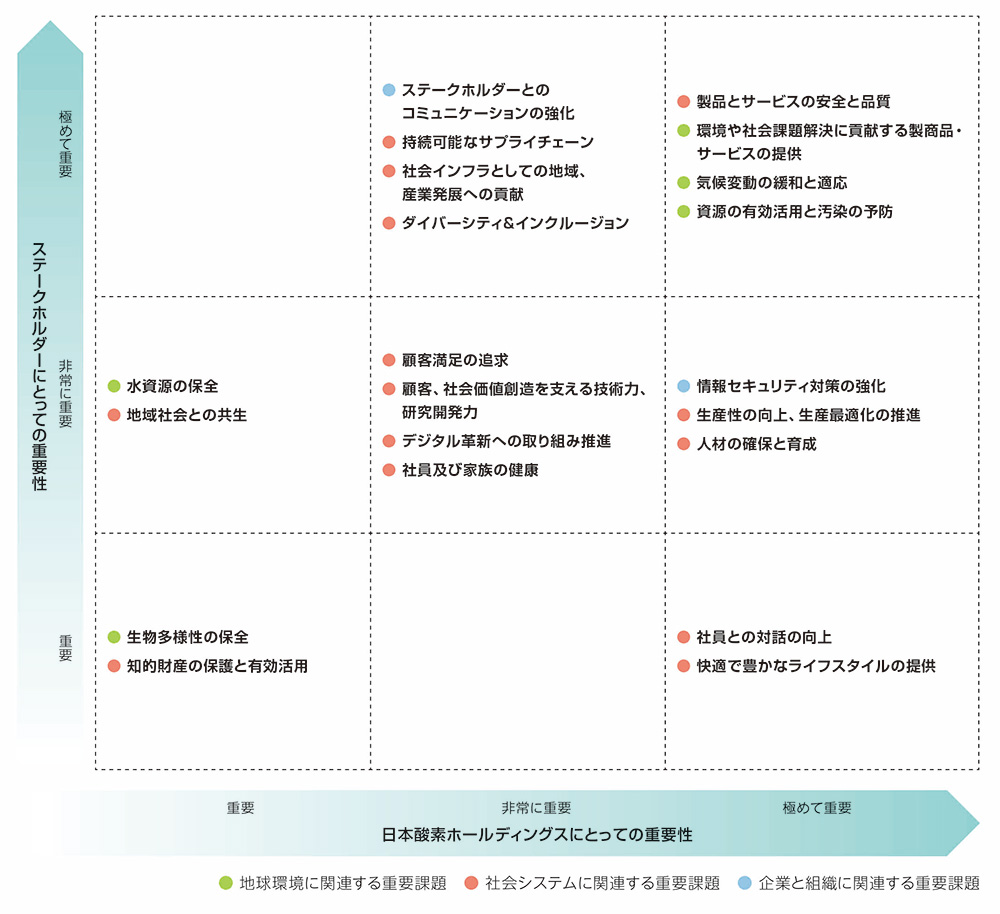 絞り込んだ重要課題及びその優先順位付けについて経営会議、グローバル戦略検討会議及び取締役会においてその妥当性の議論、総合的評価を実施し、マテリアリティ・マトリックスを作成