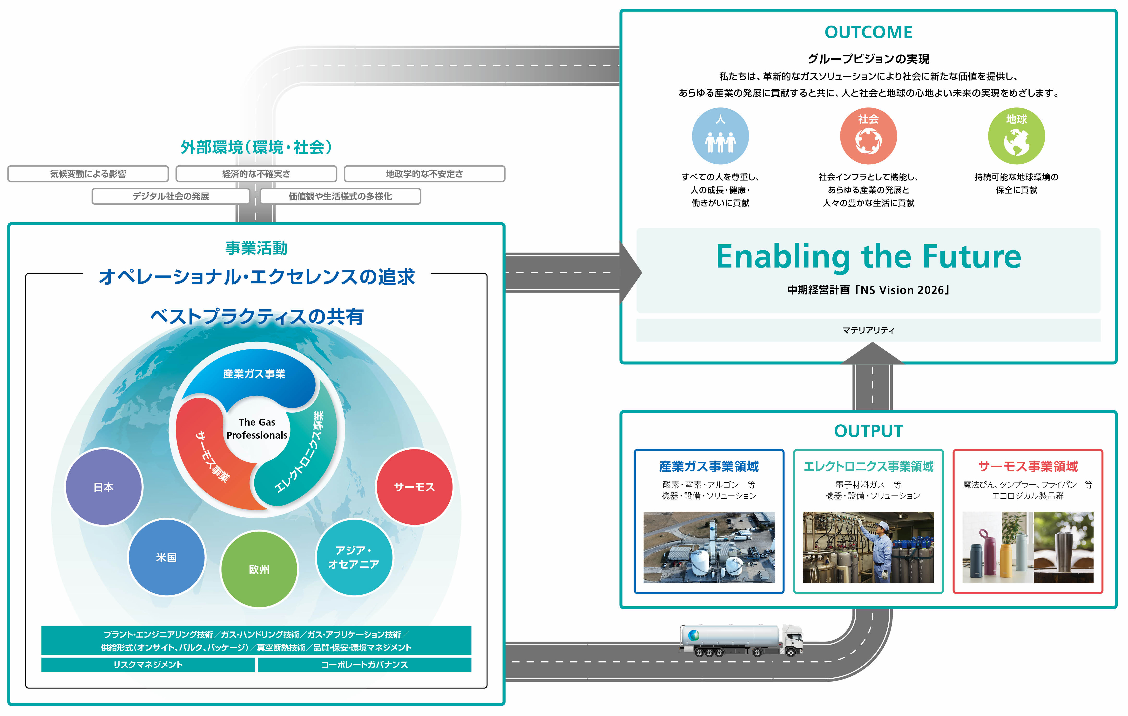 中期経営計画「NS Vision 2026」では、当社を取り巻く外部環境について、グループ全体でその認識を確認しました。そして、事業活動では各地域でのベストプラクティスを共有し、オペレーショナル・エクセレンスを追求することで、社会価値と経済価値を両立させ、さらなる企業価値の向上をめざします。