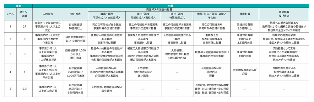 大陽日酸では、独自の事故強度基準(CCPS評価法※をベースに、高圧ガスの潜在的影響を考慮したもの)を作成し、日本で発生した設備事故について、その事故ごとに「人的被害」「物的被害」「高圧ガスの潜在的影響」「環境影響」「社会影響及び報道」の特性5項目の強度を5段階レベルで判定し、その総合ポイント数により、強度を考慮した定量評価を実施しています。